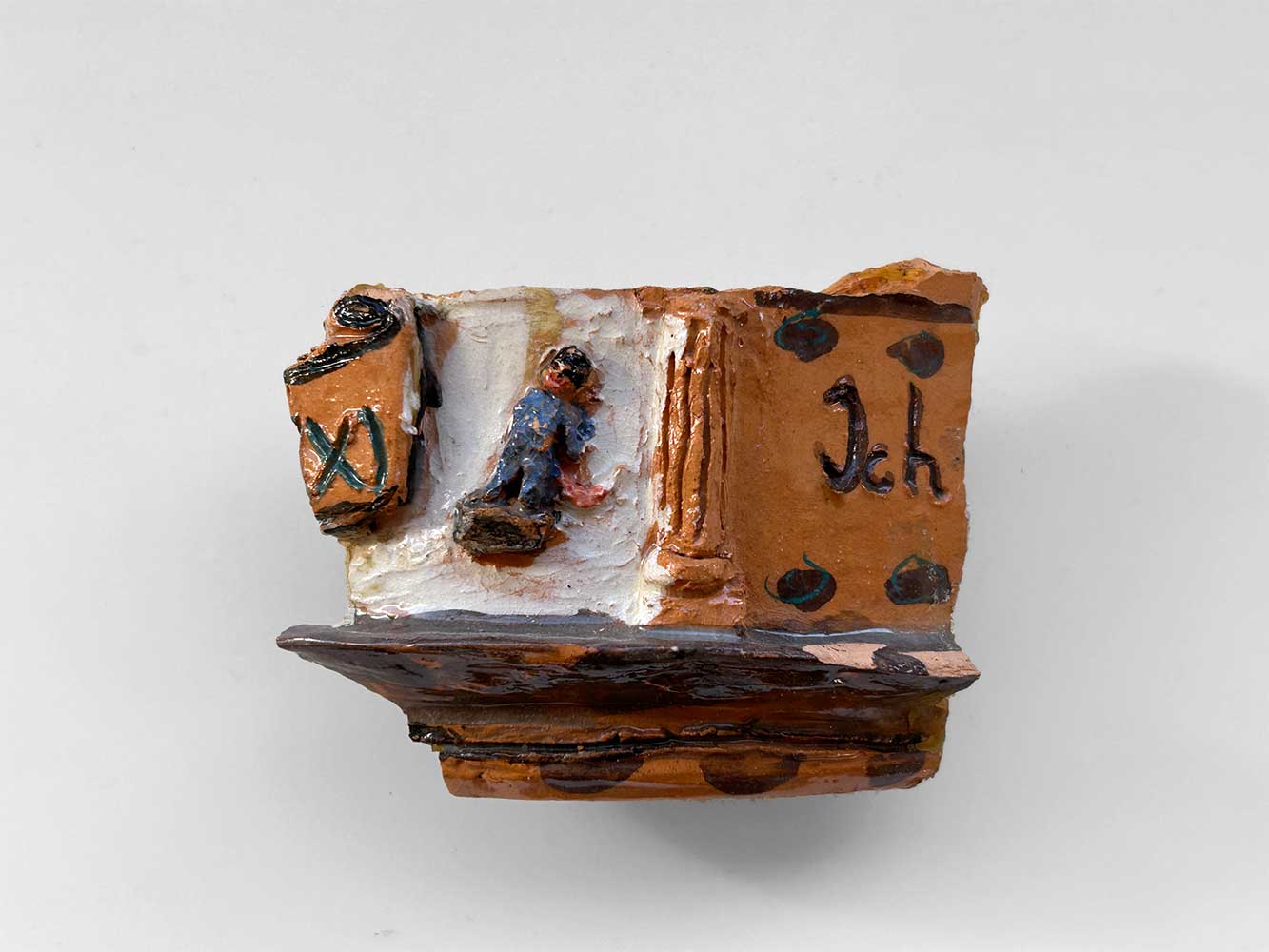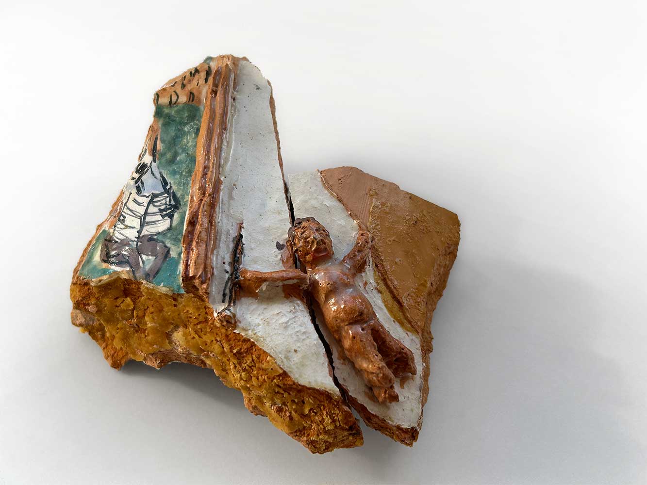 | Technik | | farbig gefasste Tonkeramik in plastischer Gestaltung auf Tonkrug (gesamt: ⌀ 14,5 cm, h 25 cm, Gewicht 3357 Gramm; geborsten beim Brennvorgang (Trümmerbruch), Bruchstücke zum kompletten Krug gekittet, 45 Jahre später fragmentiert) |