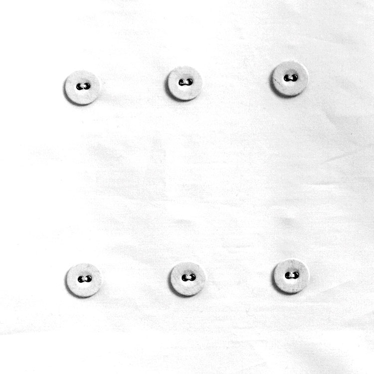 Technik | Baumwollstoff / 39 aufgenähte Wäscheknöpfe / 2 weiße Metallklammern | |