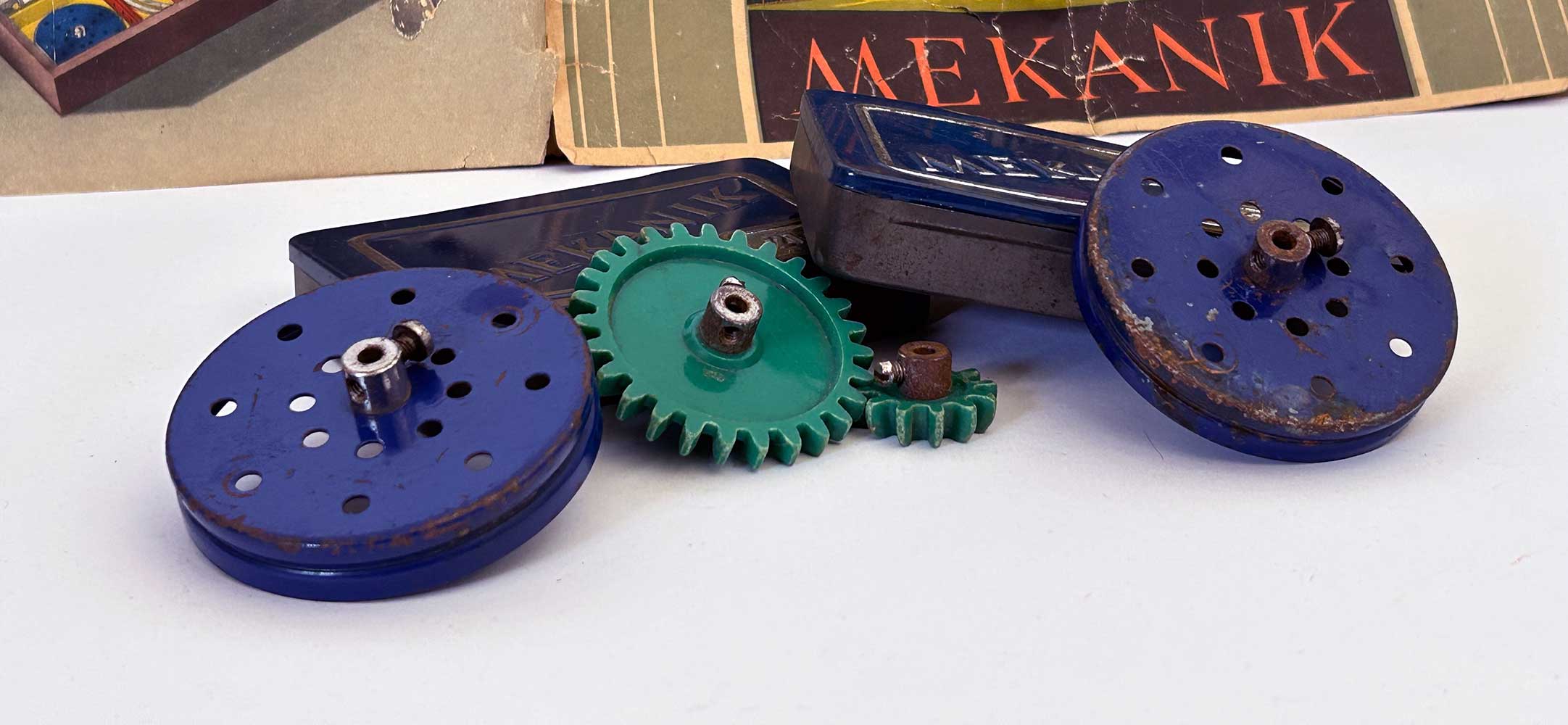 Technik | Acrylfarbe auf Schafsleder in Reinacrylat-Dispersion und Acrylfarbe, zwei Schnurräder (Stahl, blau lackiert, aus Mekanik-Metallbaukasten, 70mm, ca. 1955), Schrauben, Schraubhaken | |