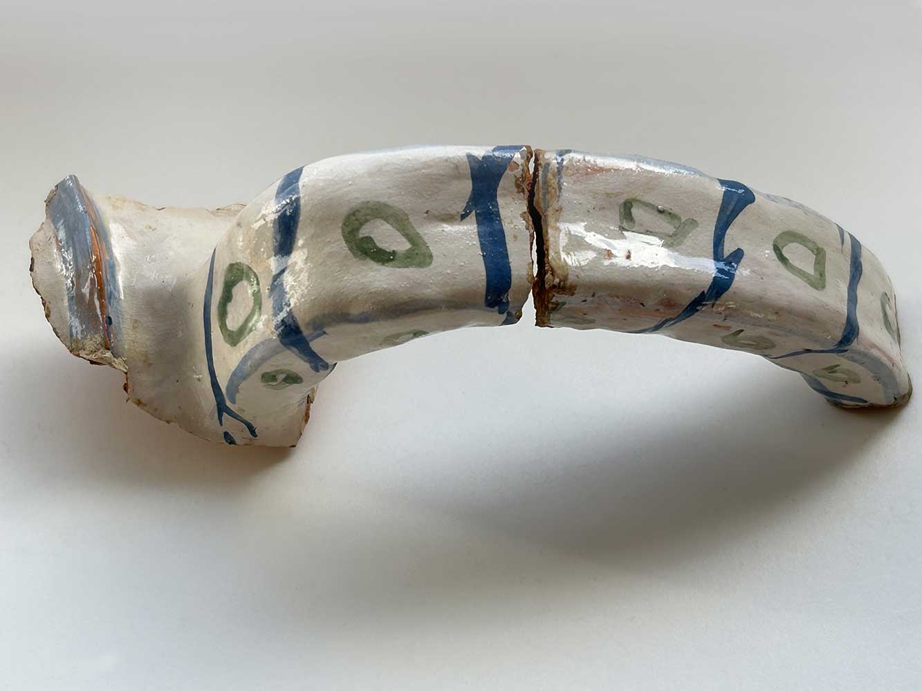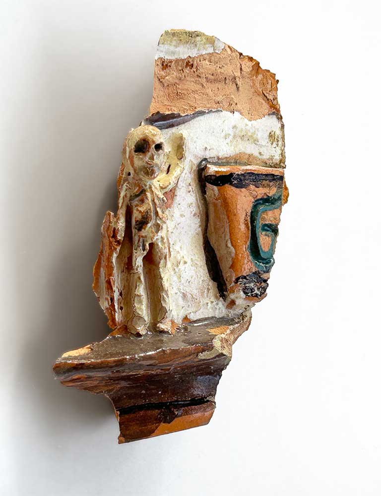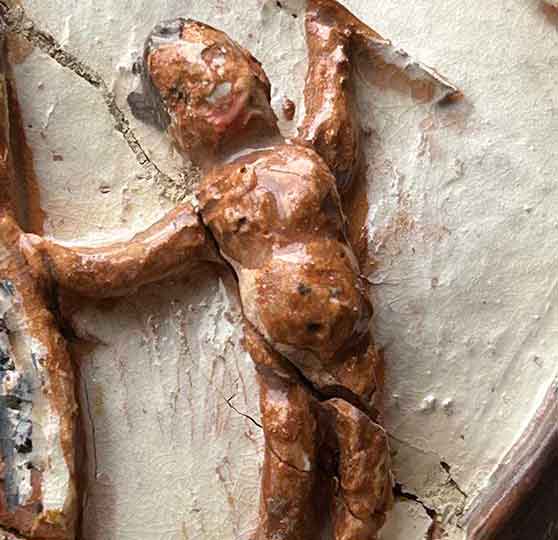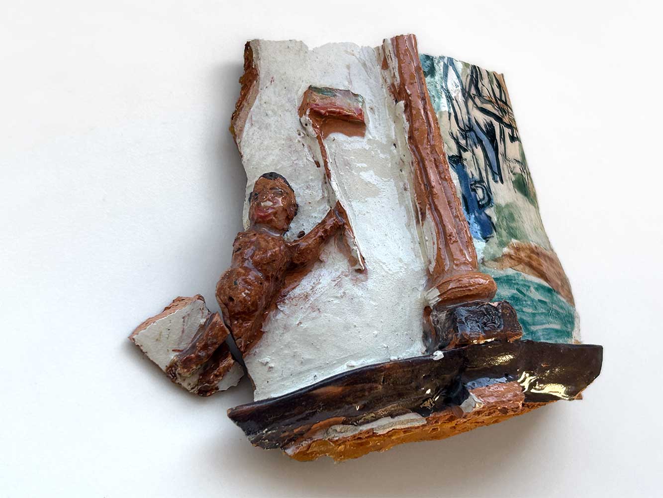 | Technik | | farbig gefasste Tonkeramik in plastischer Gestaltung auf Tonkrug (gesamt: ⌀ 14,5 cm, h 25 cm, Gewicht 3357 Gramm; geborsten beim Brennvorgang (Trümmerbruch), Bruchstücke zum kompletten Krug gekittet, 45 Jahre später fragmentiert) |