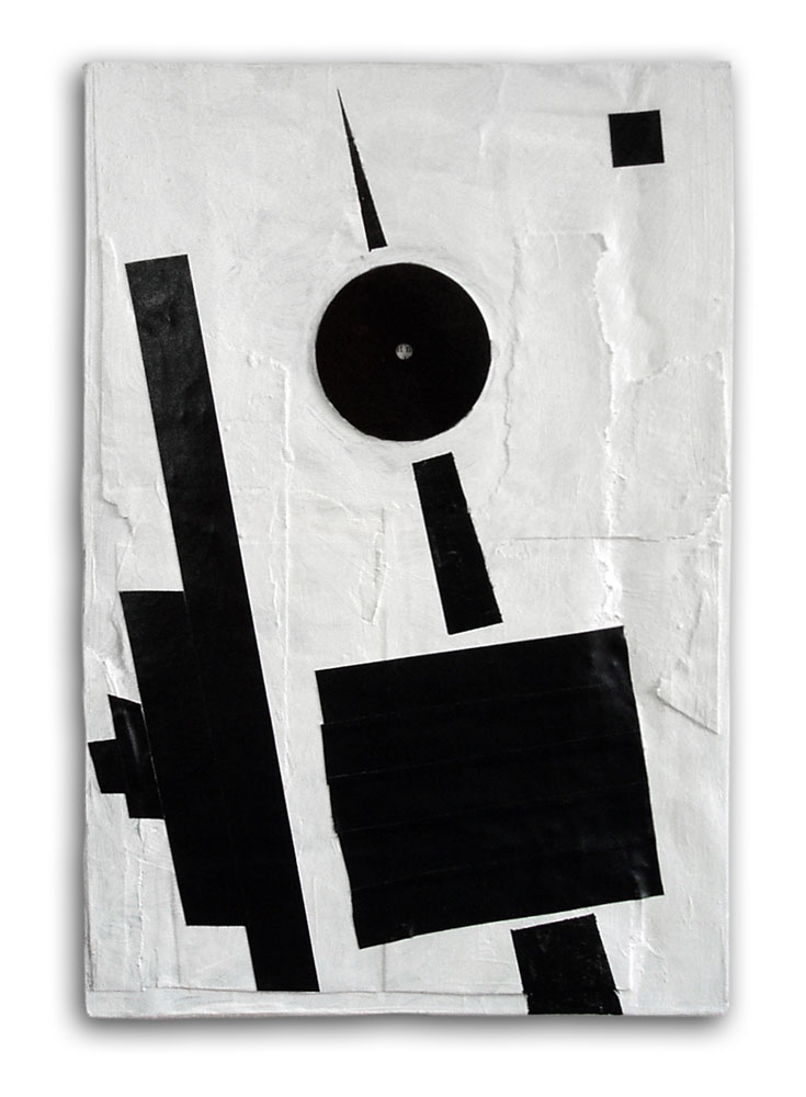 Technik | Gewebeband / Plastikscheibe (aus Zauberkasten) mit Loch / Acrylfarbe auf Papier / Pappe / Holzrahmen | |