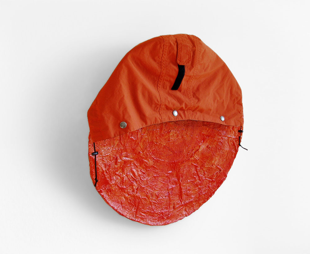 Technik | Acrylfarbe auf Zellstoff / Acrylfarbe auf Spachtelmasse auf Leinwand / Kapuze / Draht / Klemme | |