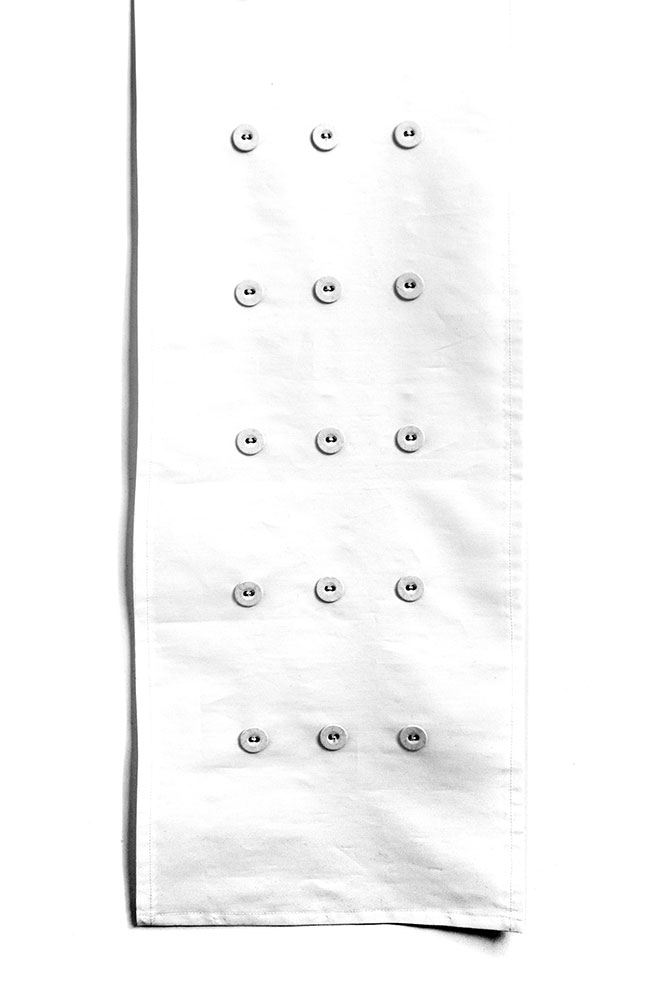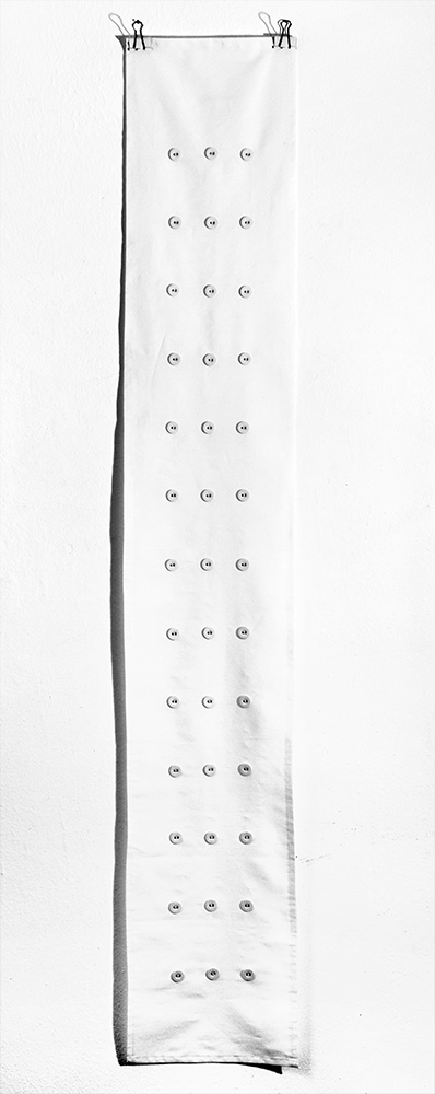 Technik | Baumwollstoff / 39 aufgenähte Wäscheknöpfe / 2 weiße Metallklammern | |