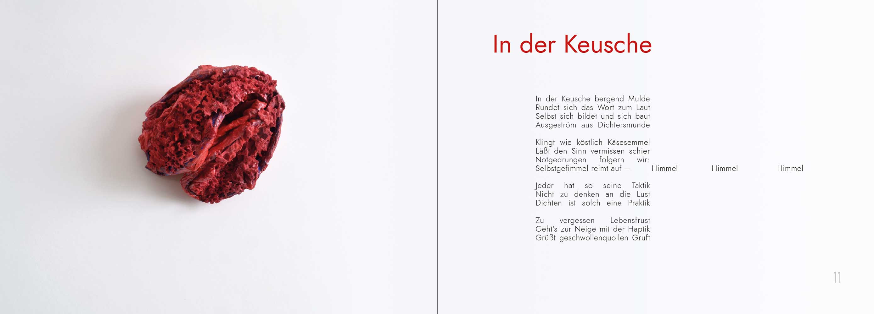 Bemerkung | Aufbewahrung in Pappschachtel (18,5 x 12,5 x 12 cm) In der Keusche In der Keusche bergend Mulde Rundet sich das Wort zum Laut Selbst sich bildet und sich baut Ausgeström aus Dichtersmunde Klingt wie köstlich Käsesemmel Läßt den Sinn vermissen schier Notgedrungen folgern wir: Selbstgefimmel reimt auf – Himmel Himmel Himmel Jeder hat so seine Taktik Nicht zu denken an die Lust Dichten ist solch eine Praktik Zu vergessen Lebensfrust Geht’s zur Neige mit der Haptik Grüßt geschwollenquollen Gruft [ Castitas = Keuschheit, Mäßigung – Sublimation in eine veredelte Form – Epizeuxis – Sonett – 2021 ] 'In der Keusche' (Aufnahme: Tonstudio On-the-ottoman, 20.04.2024) -> 'Keusche', in: Frühneuhochdeutsches Wörterbuch1 -> 'Keusche', in: Deutsches Wörterbuch von Jacob Grimm und Wilhelm Grimm, digitalisierte Fassung im Wörterbuchnetz des Trier Center for Digital Humanities, Version 01/23, abgerufen am 31.01.2024. 2 -> 'Keusche' in: Wörterbuch der deutschen Winzersprache 3 -> […] auf 'Himmel', reimt […]4 1[ 'Keusche' in: Frühneuhochdeutsches Wörterbuch //(externer Link)// ] 2[ 'Keusche', in: Deutsches Wörterbuch von Jacob Grimm und Wilhelm Grimm //(externer Link)// ] 3[ 'Keusche' in: Wörterbuch der deutschen Winzersprache //(externer Link)// ] 4[ Arno Schmidt: Bargfelder Ausgabe - Zettel’s Traum / Abt. 4, Bd. 1 / S. 630 //eba (externer Link)// ] 'In der Keusche' (Vortragsnotation) ![]() |