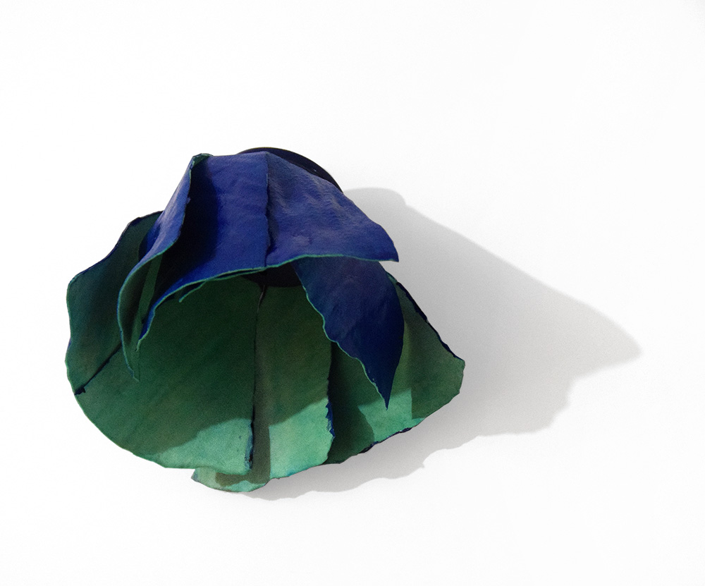 Technik | Acrylfarbe auf Schafsleder in Reinacrylat-Dispersion und Acrylfarbe, zwei Schnurräder (Stahl, blau lackiert, aus Mekanik-Metallbaukasten, 70mm, ca. 1955), Schrauben, Schraubhaken | |