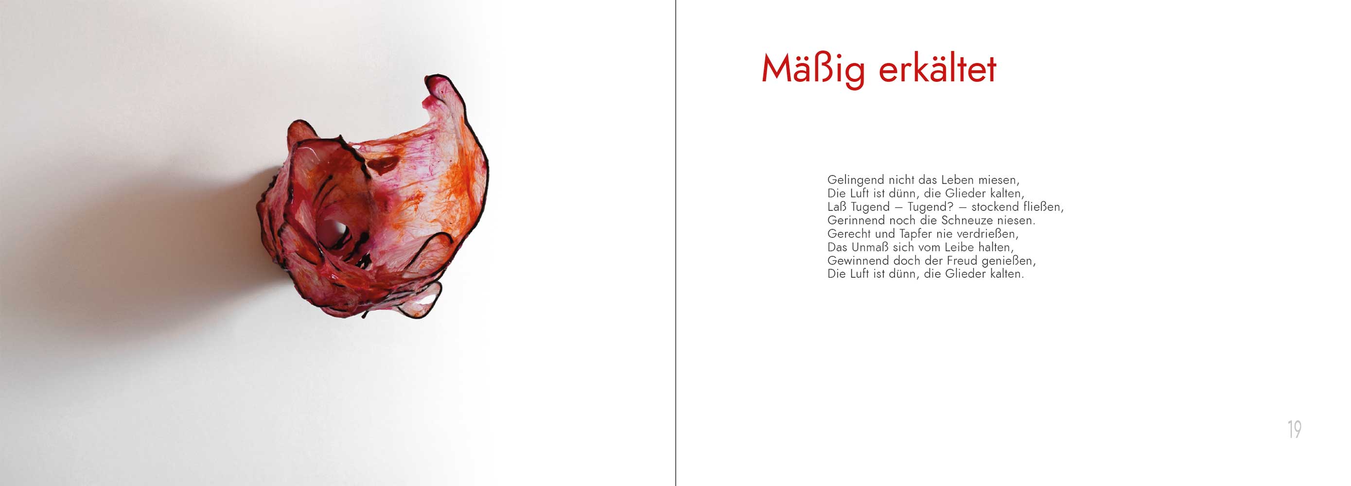 Bemerkung | Aufbewahrung in Pappschachtel (22,5 x 23,5 x 16,5 cm) Mäßig erkältet Gelingend nicht das Leben miesen, Die Luft ist dünn, die Glieder kalten, Lass Tugend – Tugend? – stockend fließen, Gerinnend noch die Schneuze niesen. Gerecht und tapfer nie verdrießen, Das Unmaß sich vom Leibe halten, Gewinnend doch der Freud genießen, Die Luft ist dünn, die Glieder kalten. [ Temperantia (lat.) / Sōphrosýne (altgr.) = Mäßigung, Beherrschung, besonnene Gelassenheit, Besonnenheit (eine der vier platonischen Kardinaltugenden) – Im "Siebenkäs" von J. Paul entzündet sich am Lichtschneuzen ein Ehestreit – Triolett – 2021 ] 'Mäßig erkältet'(Aufnahme: Tonstudio ~~~~ 'Within-the-wardrobe', 21.09.2024) 'Mäßig erkältet' (Vortragsnotizen) ![]() 'Mäßig erkältet'(Aufnahme: Tonstudio ~~~~ 'Top-of-the-cold-shed', 09.10.2024) 'Mäßig erkältet' (Vortragsnotizen) ![]() 'Mäßig erkältet'(Aufnahme: Tonstudio ~~~~ 'Inside-the-wash-drum', 10.10.2024) 'Mäßig erkältet'(Aufnahme: Tonstudio ~~~~ 'Under-the-hamper', 17.10.2024) 'Mäßig erkältet' (Vortragsnotizen) ![]() 'Mäßig erkältet'(Aufnahme: Tonstudio ~~~~ 'Close-to-cascading-cacophonia', 29.10.2024) |