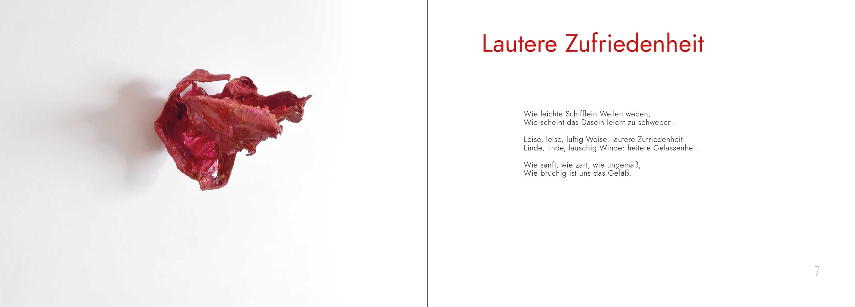 ![]() ![]() Lautere Zufriedenheit Wie leichte Schifflein Wellen weben, Wie scheint das Dasein leicht zu schweben. Leise, leise, luftig Weise: lautere Zufriedenheit. Linde, linde, lauschig Winde: heitere Gelassenheit. Wie sanft, wie zart, wie ungemäß, Wie brüchig ist uns das Gefäß. [ Sufficientia = Genügsamkeit, Zufriedenheit – Unter Verwendung von Motiven aus C. Brentano "Wiegenlied" und H. v. Bingen "Liber vitae meritorum" (V. Teil, lautere Zufriedenheit, das eigentliche Ziel des Tugendweges) – 2021 ] |