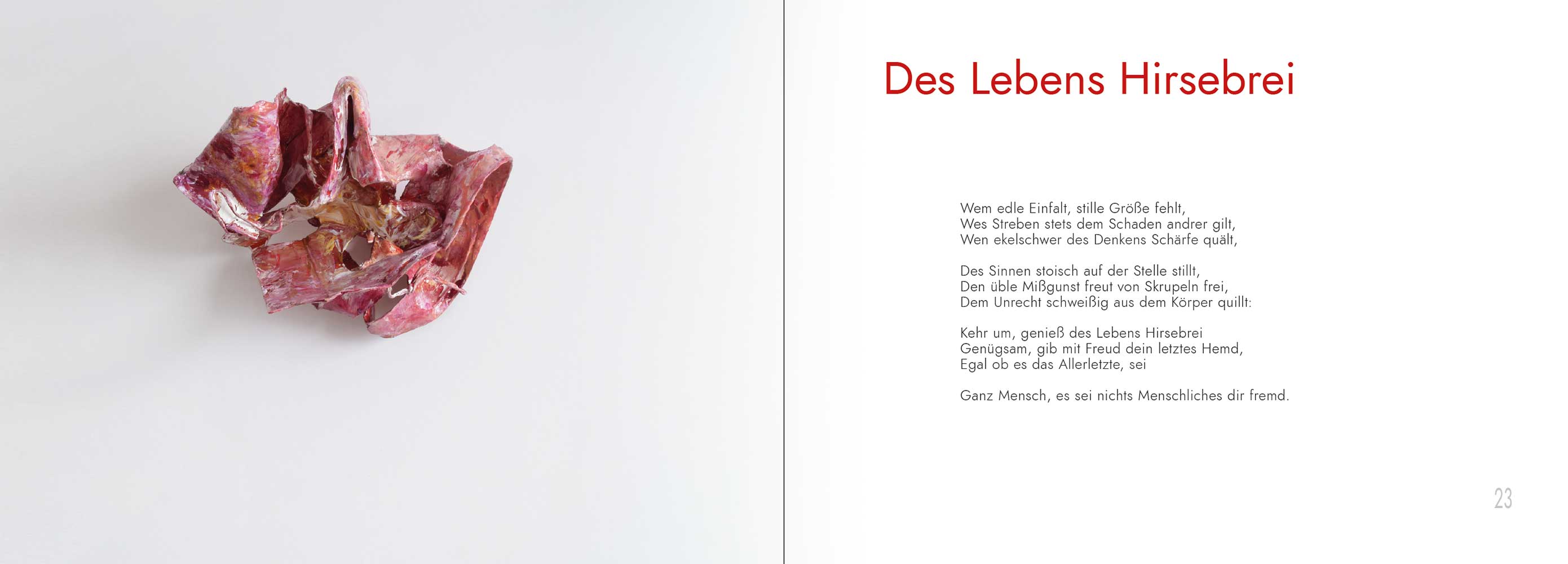 Bemerkung | ![]() Des Lebens Hirsebrei Wem edle Einfalt, stille Größe fehlt, Wes Streben stets dem Schaden andrer gilt, Wen ekelschwer des Denkens Schärfe quält, Des Sinnen stoisch auf der Stelle stillt, Den üble Mißgunst freut von Skrupeln frei, Dem Unrecht schweißig aus dem Körper quillt: Kehr um, genieß des Lebens Hirsebrei Genügsam, gib mit Freud dein letztes Hemd, Egal ob es das Allerletzte, sei Ganz Mensch, es sei nichts Menschliches dir fremd. [ Humanitas = Wohlwollen, Menschlichkeit, Milde – Nach Marcus Tullius Cicero vollendet sich der Mensch über universale Erziehung, Selbstbildung durch Affektbeherrschung, Verantwortungsbewusstsein sowie durch gelebte heitere und kultivierte Menschlichkeit. – Unter Verwendung von J. J. Winckelmann "edle Einfalt und stille Größe" und Terenz "Homo sum, humani nil a me alienum puto (lat.: Ich bin ein Mensch, nichts Menschliches ist mir fremd.)" – Hirsebrei war früher ein Armeleuteessen – Terzine – 2021 ] |