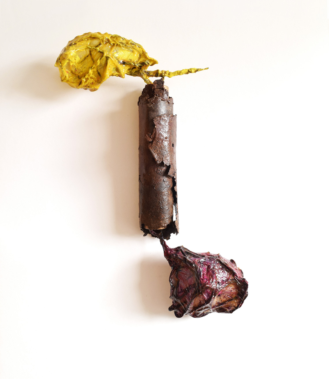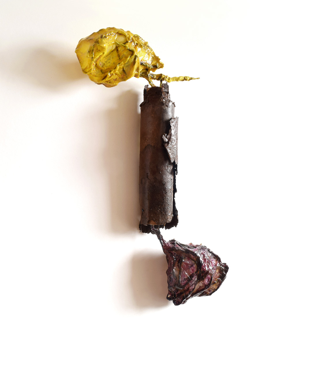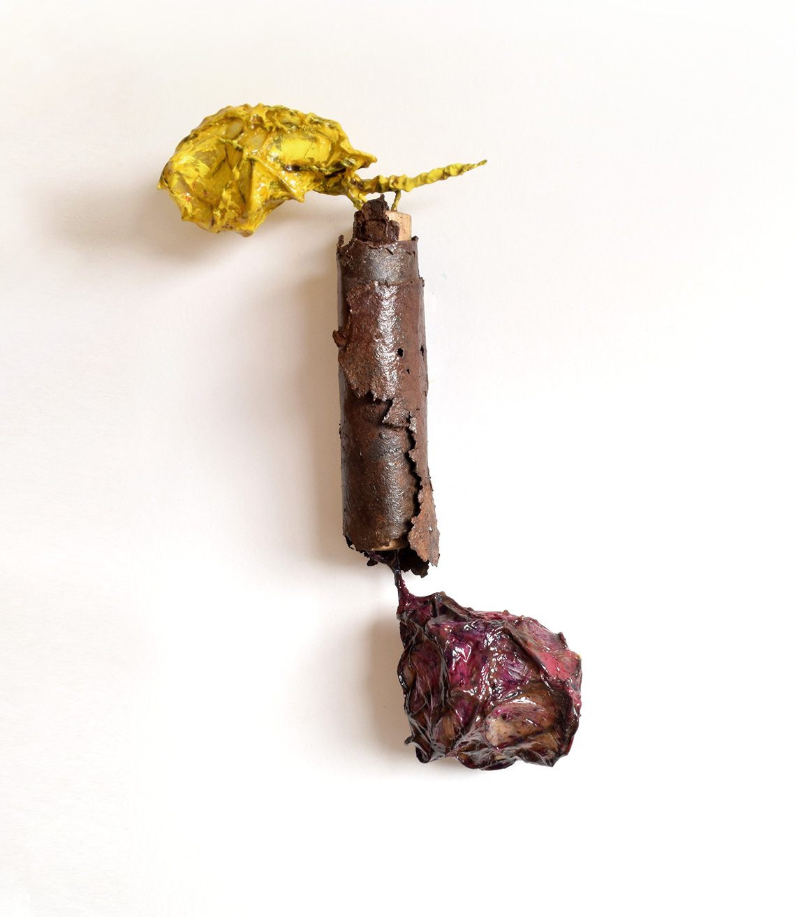 Technik | oberes und unteres Element: Reinacrylat-Dispersion und Acrylfarbe in Zellstoff, Acrylfarbe / Draht; mittleres Element: Eisenblech (Fundobjekt) gerollt, Holz, Eisenkleinteil, Schrauben | |