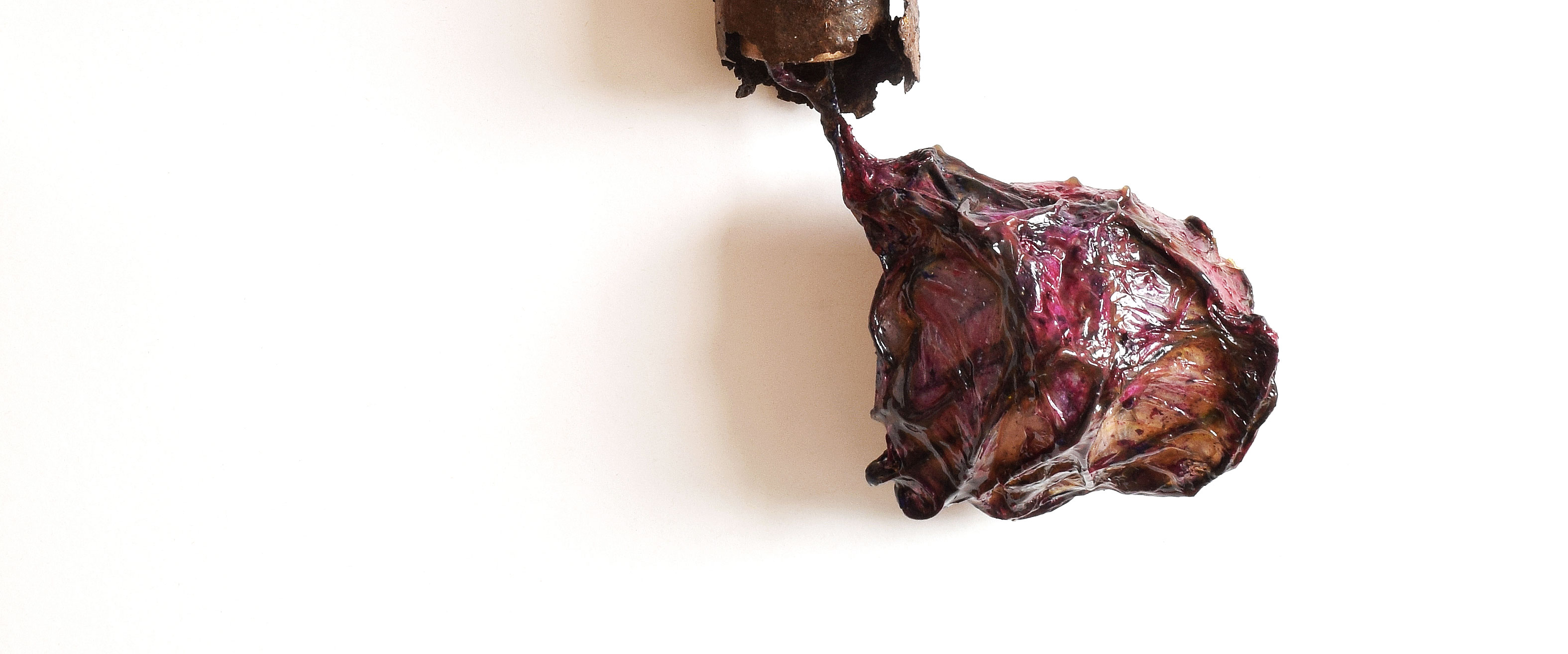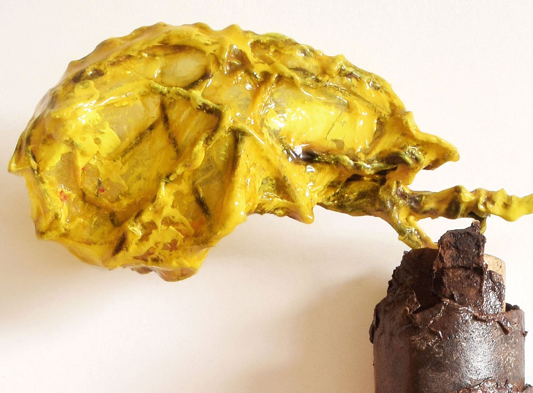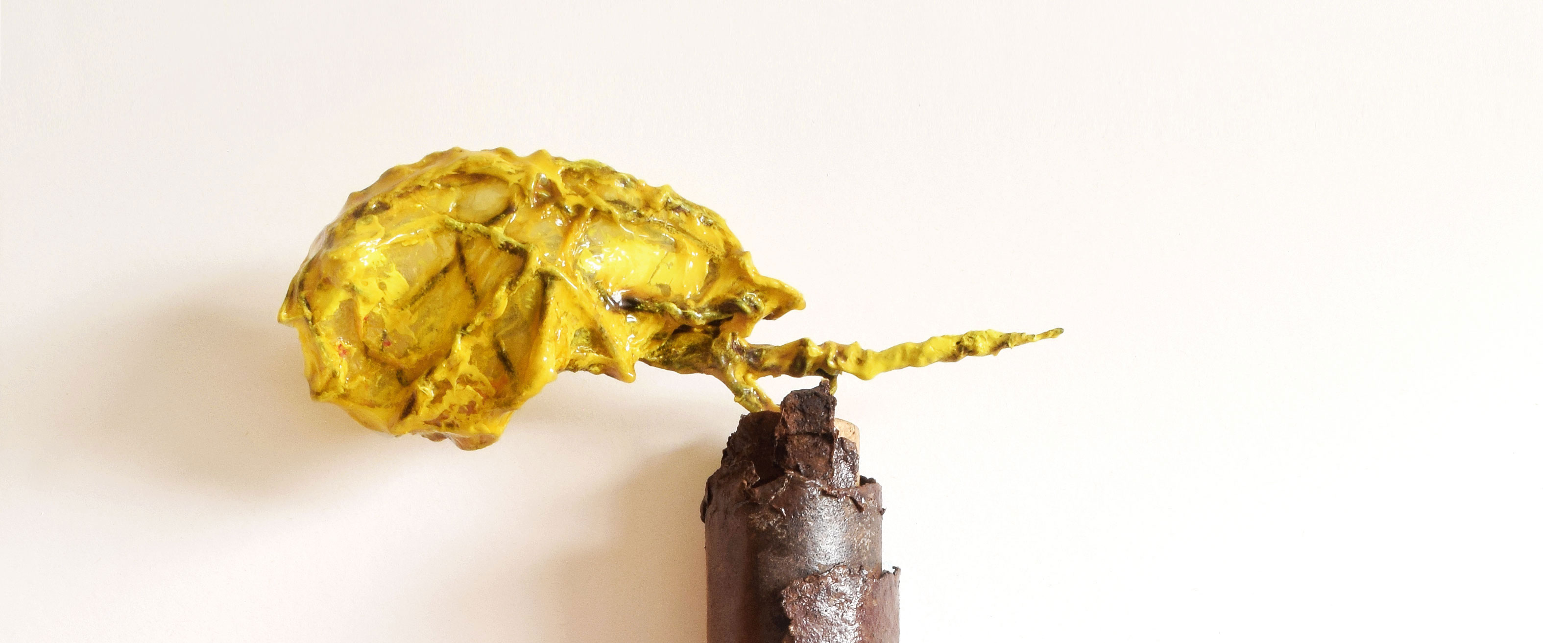 Technik | oberes und unteres Element: Reinacrylat-Dispersion und Acrylfarbe in Zellstoff, Acrylfarbe / Draht; mittleres Element: Eisenblech (Fundobjekt) gerollt, Holz, Eisenkleinteil, Schrauben | |