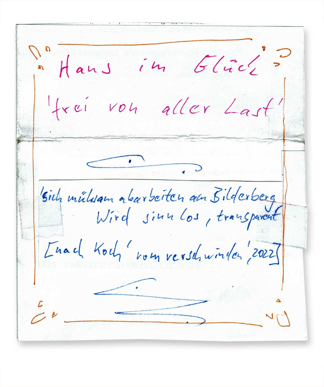 Signatur (rs=Rückseite; vs=Vorderseite) | Günter Koch 202310 (Hans im Glück) (rs) | |