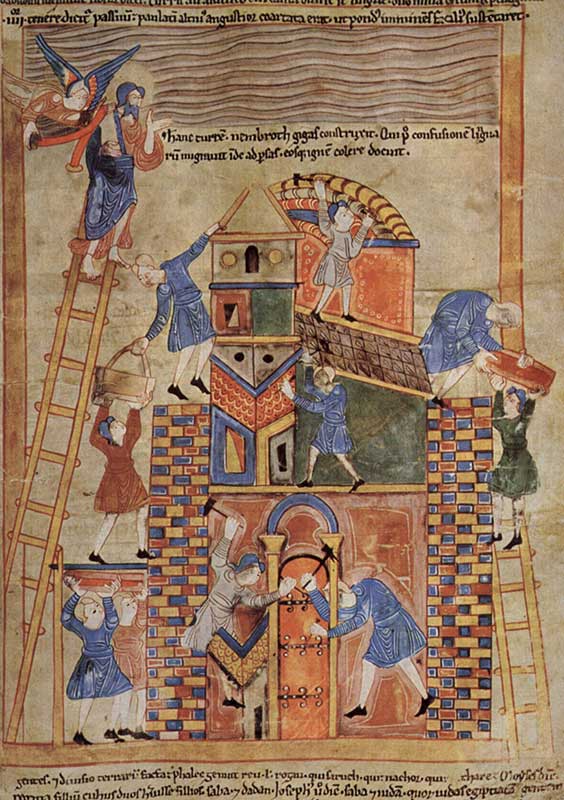 (ῥοδοδάκτυλος Ἠώς rhododáktylos Ēṓs)) Das Buch Genesis, Kapitel 11 Der Turmbau zu Babel ![]() Alle Menschen hatten die gleiche Sprache und gebrauchten die gleichen Worte. ![]() Als sie von Osten aufbrachen, fanden sie eine Ebene im Land Schinar und siedelten sich dort an. ![]() Sie sagten zueinander: Auf, formen wir Lehmziegel und brennen wir sie zu Backsteinen. So dienten ihnen gebrannte Ziegel als Steine und Erdpech als Mörtel. ![]() Dann sagten sie: Auf, bauen wir uns eine Stadt und einen Turm mit einer Spitze bis zum Himmel und machen wir uns damit einen Namen, dann werden wir uns nicht über die ganze Erde zerstreuen. ![]() Da stieg der Herr herab, um sich Stadt und Turm anzusehen, die die Menschenkinder bauten. ![]() Er sprach: Seht nur, ein Volk sind sie und eine Sprache haben sie alle. Und das ist erst der Anfang ihres Tuns. Jetzt wird ihnen nichts mehr unerreichbar sein, was sie sich auch vornehmen. ![]() Auf, steigen wir hinab und verwirren wir dort ihre Sprache, sodass keiner mehr die Sprache des anderen versteht. ![]() Der Herr zerstreute sie von dort aus über die ganze Erde und sie hörten auf, an der Stadt zu bauen. ![]() Darum nannte man die Stadt Babel (Wirrsal), denn dort hat der Herr die Sprache aller Welt verwirrt, und von dort aus hat er die Menschen über die ganze Erde zerstreut. ↑ 'Phase 4 ≙ die Paraphernalien'